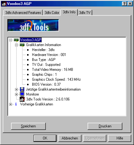 Andersherum verhält sich der TV-Ausgang, beim Boot sieht man nur ein paar Streifen auf der Mattscheibe. Ein Bild sieht man erst nach dem Laden der Treiber, allerdings werden die Einstellungen nicht gespeichert und der Fernseher nach dem Start immer mit einem NTSC Signal angesprochen. Eine Serien Voodoo3 3000 AGP hat mit denselben Treiber dieses Problem nicht und merkt sich die PAL Einstellung.